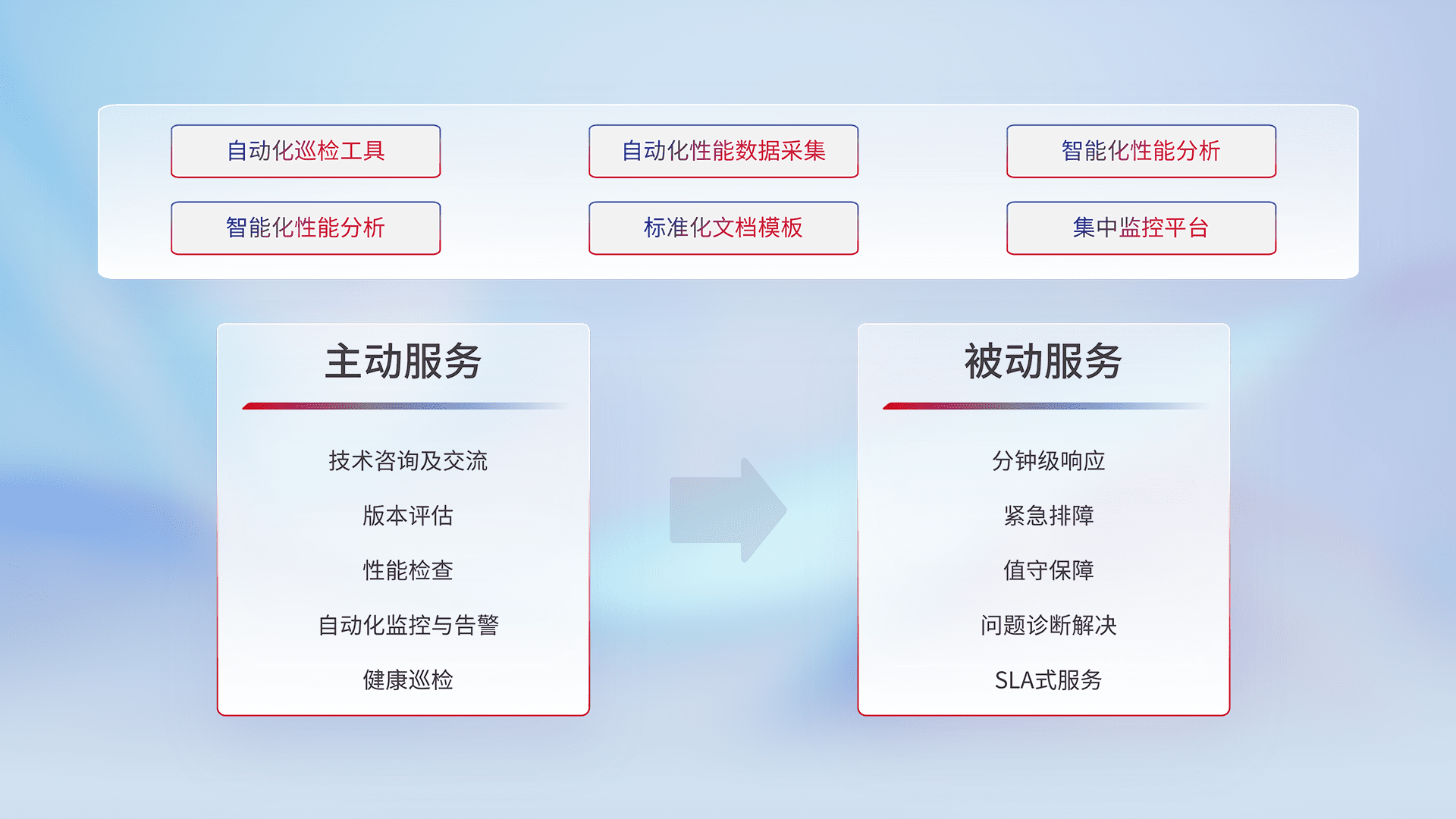智能化工具和标准化文档,,,保障服务质量,,提供主动服务(包含技术咨询、、、、版本评估、、、性能检查、、自动化监控与告警、、、健康巡检)和被动服务包含(分钟级响应、、、紧急排障、、值守保障、、、、问题诊断解决、、、、SLA服务)。。。。